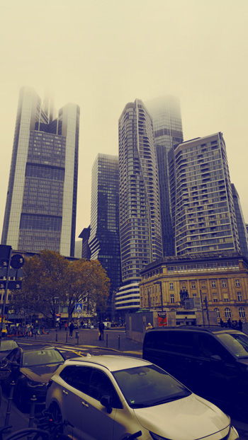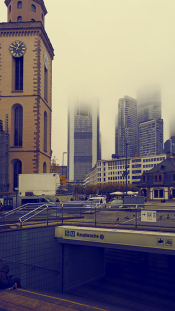 | 916 PHOTO MODE – Hauptwache Frankfurt (November 2025) Mit meinem Smartphone eingefangen und nachträglich farblich modifiziert. © streckov ! Bildstrecke von der nebelverhangenen Skyline aus am Roßmarkt, hinüber zum Anfang der Zeil, bis hinunter in den vorderen Untergrundbereich der Hautptwache B-Ebene. |